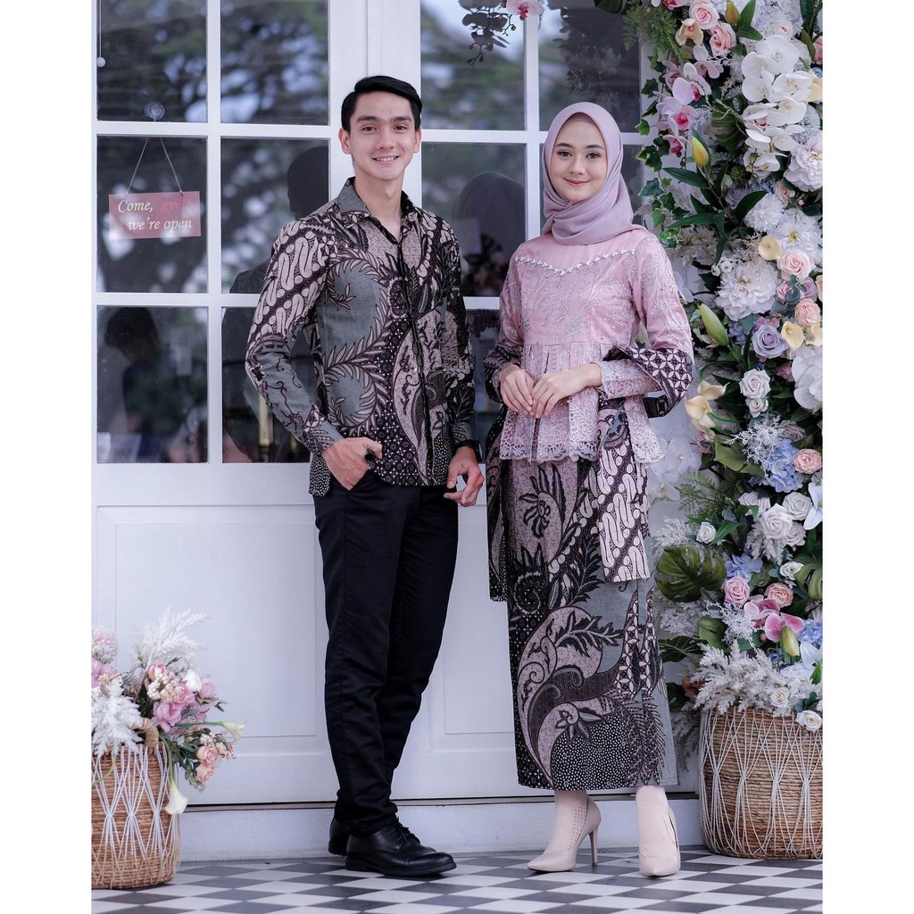 Kamu bisa kenakan setelan kebaya dan kain songket warna pink keunguan sedangkan pasangan kenakan kemeja berwarna sama. Ada baju kondangan muslim syari couple pernikahan brokat batik terbaru. Baju muslim couple bukan berarti memiliki pola serta warna yang sama persis.